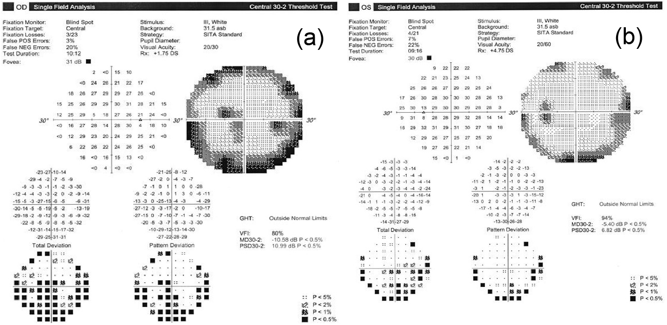 A 49-year-old male patient presented to the OPD with complaints of headache, giddiness and gradual diminution of vision in his left eye for one week. It was painless and gradually progressive loss of vision involving the peripheral visual fields. He had a history of giddiness on getting up from lying down, tingling and numbness of both upper and lower limbs associated with intermittent left sided headaches. He was non diabetic, non-hypertensive. On initial examination, his pulse rate was 88 bpm, blood pressure was 160/100 mmHg, body temperature of 99 F. His random blood sugar was 135 mg/dl. On ophthalmic examination, his best corrected visual acuity in his right eye was 6/9 and it was 6/18 in his left eye. His near vision was N8 in both eyes and his color vision was 1/17 in both eyes. On applanation tonometry, his intraocular pressure was 15 mmHg in his right eye and 24 mmHg in his left eye. On slit lamp examination, both lids, conjunctiva and cornea were normal. There was no evidence of any cells and flare in the anterior chamber in both eyes. Patient had neovascularization of iris in the left eye. Lens showed nuclear cataract of grade 2 with posterior subcapsular cataract in both eyes. The pupil of the left eye showed RAPD grade 4 in his left eye. Undilated fundus examination revealed neovascularization at disc with vitreous florets and old vitreous hemorrhage in his right eye and neovascularization of disc with dense hemorrhage over the disc with vitreous strands in the left eye. A visual perimetry was ordered and it showed circumferential field defects in both eyes (Figure 1).