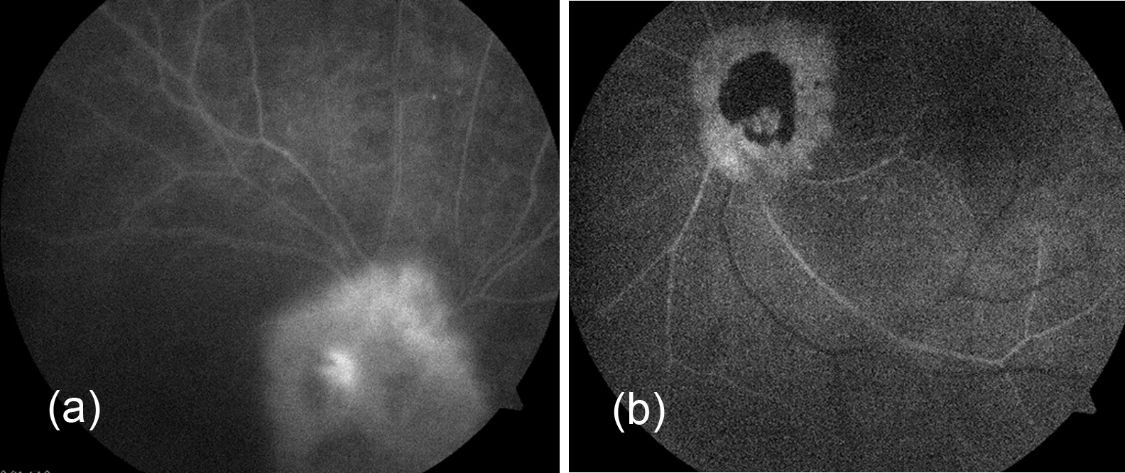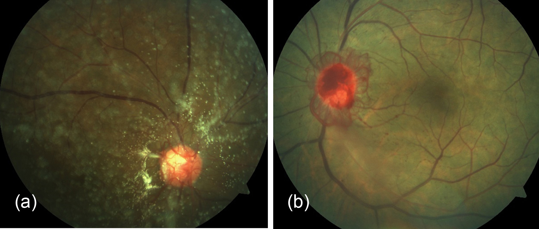 Figure 2a,b: Fundus photo with neovascularization of disc BE with dispersed vitritis.