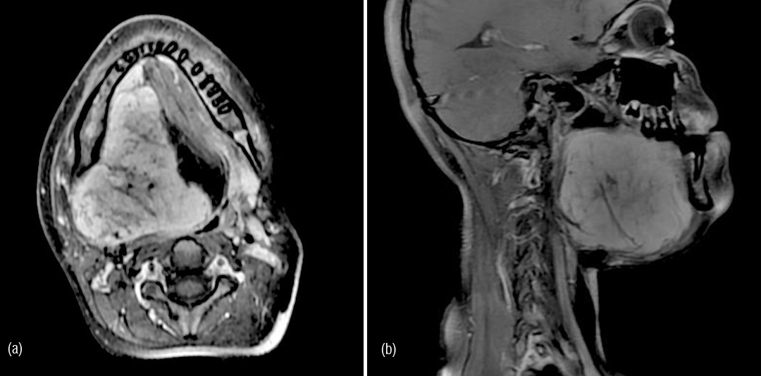 Figure 1a,b: MRI axial and saggital - lesion in right sublingual and submandibular region.