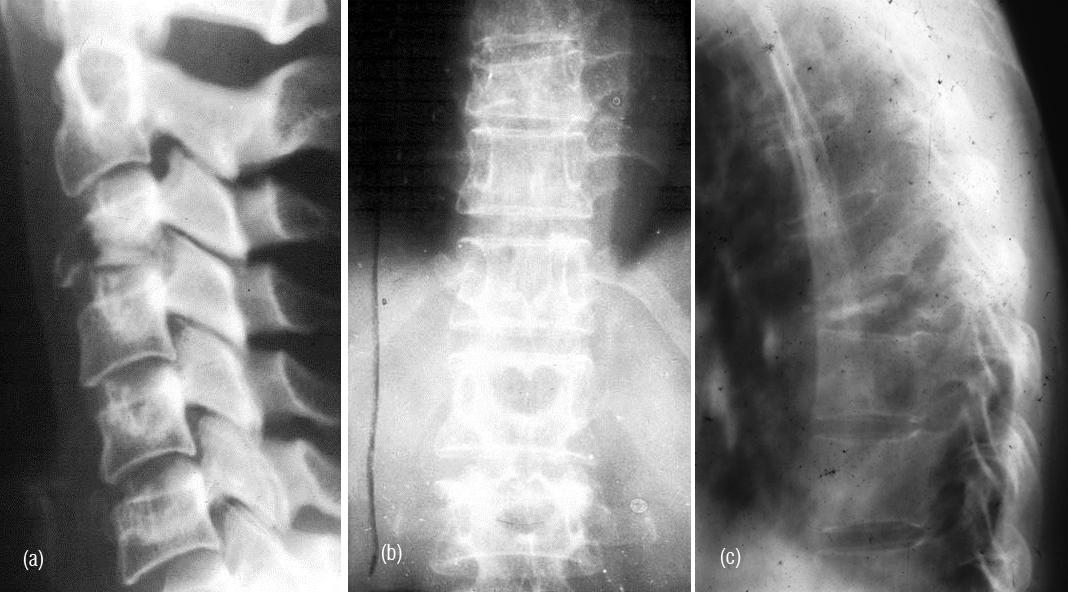 Figure 1a,b: Plasmacytoma with collapse of C3, T10. (c) Plasmacytoma – vertebra plana T8.