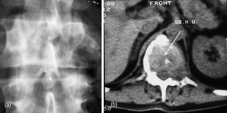 Figure 2: (a) Plasmacytoma of L2, (b) CT guided biopsy.