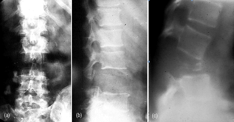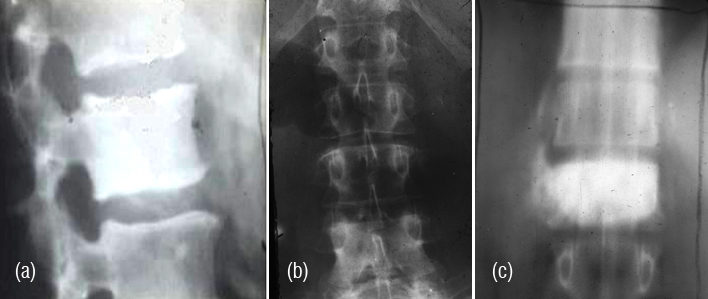 Figure 13: (a) Lymphoma (Ivory vertebra) involving the body of L1. (b) Hodgkin’s lymphoma. Note the ivory pedicles. (c) Hodgkin’s lymphoma – conventional tomogram.