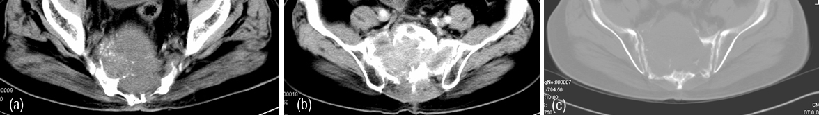 Figure 4a,b,c: CT - Plasmacytoma of sacrum, an expanding lytic lesion.
