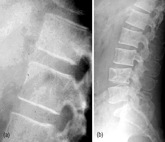 Figure 6: Multiple Myeloma – (a) Diffuse osteopenia with loss of trabeculae, (b) lytic lesions in the bodies.