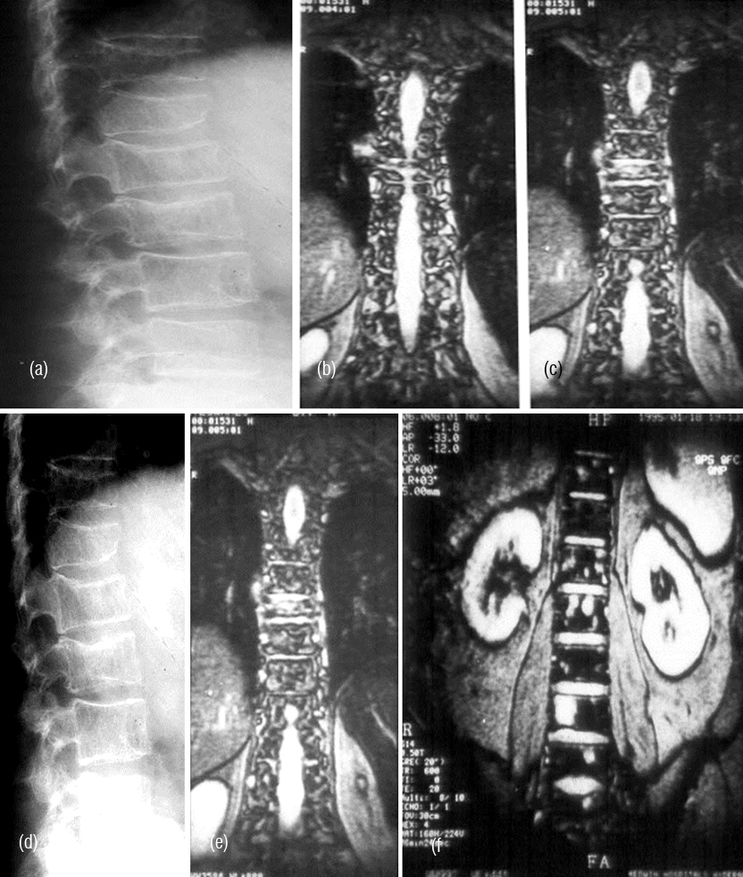Figure 7: (a,b,c) Multiple myeloma with osteopenia and early collapse of vertebral bodies BC MRI of the same patient. (d) plain films, (e, f) MRI.