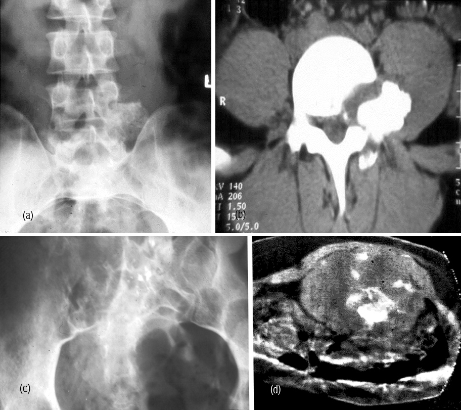 Figure 10: Chondrosarcoma L5 – (a) plain films, (b) CT helps in identification of small calcifications. (c) plain, (d) MRI.