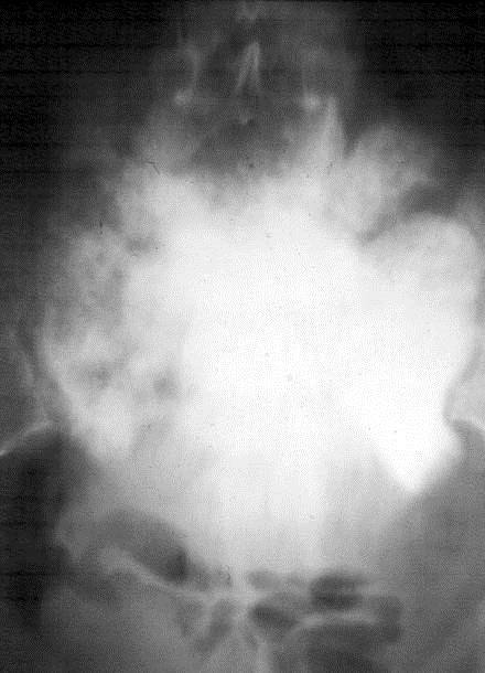 This is another rare tumor that involves the vertebral column. Several instances have been reported involving single vertebral body of spine more commonly sacrum. Radiologically, both lytic and sclerotic changes are noted with new tumor bone formation. When it occurs in the sacrum it may simulate an ivory body (Figure 12). When sclerotic metastasis occur in a solitary vertebra it is difficult to differentiate from primary osteosarcoma.