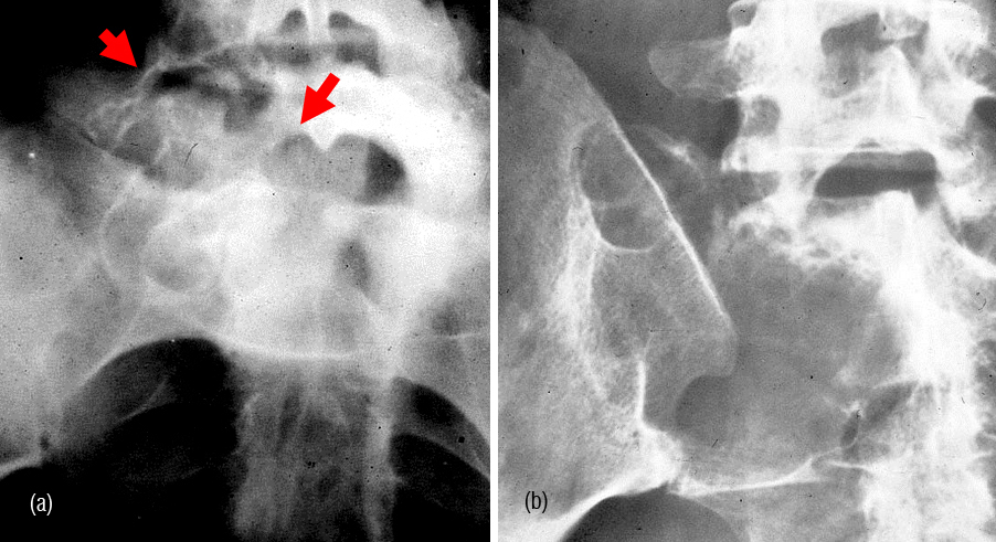 Figure 14: (a) Malignant Fibrous Histiocytoma involving L5 and sacrum on right side. (b) Malignant Fibrous Histiocytoma of the sacrum involving right iliac bone.