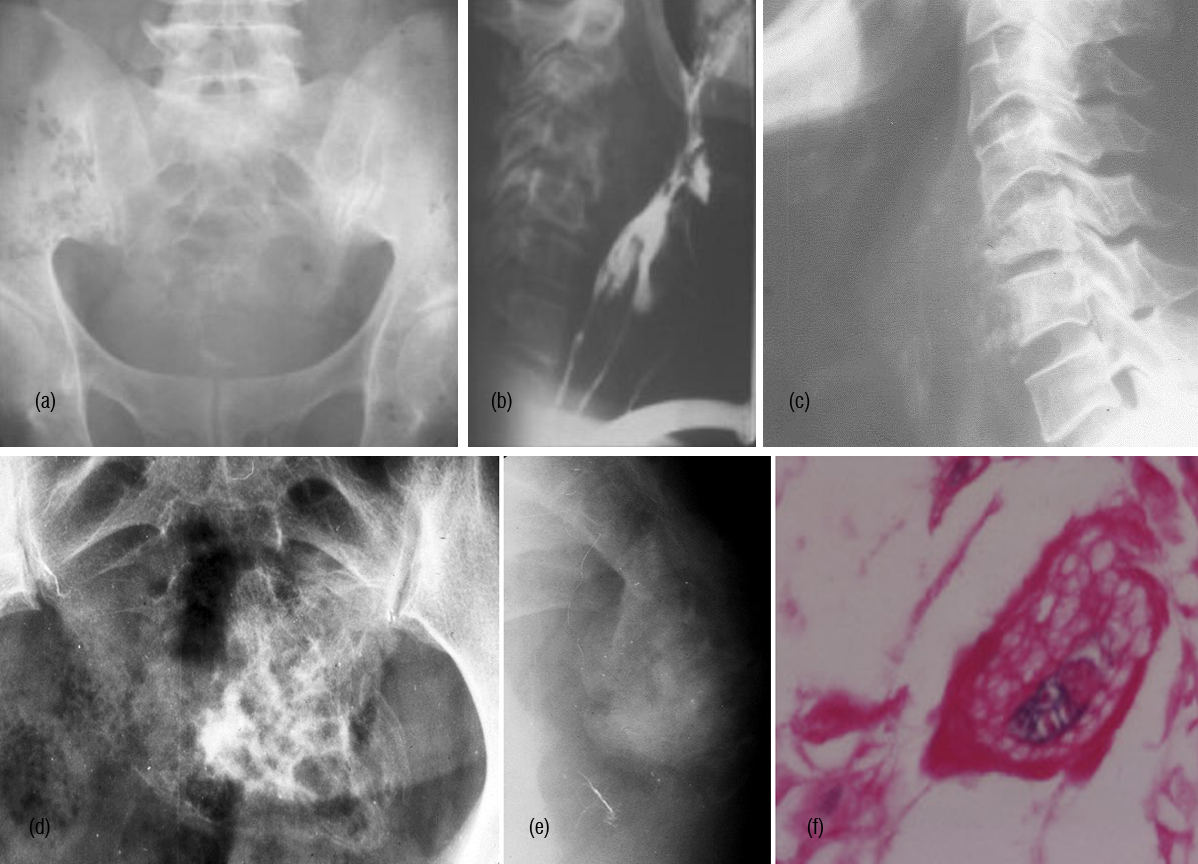Figure 15: (a) Chordoma of sacrum, (b) Chordoma C. Spine with soft tissue swelling compressing the pharynx , (c) Chordoma C. Spine (d) Chondroid chordoma – AP, (e) lateral of sacrum. (f) Chordoma – Physalipherus cell.