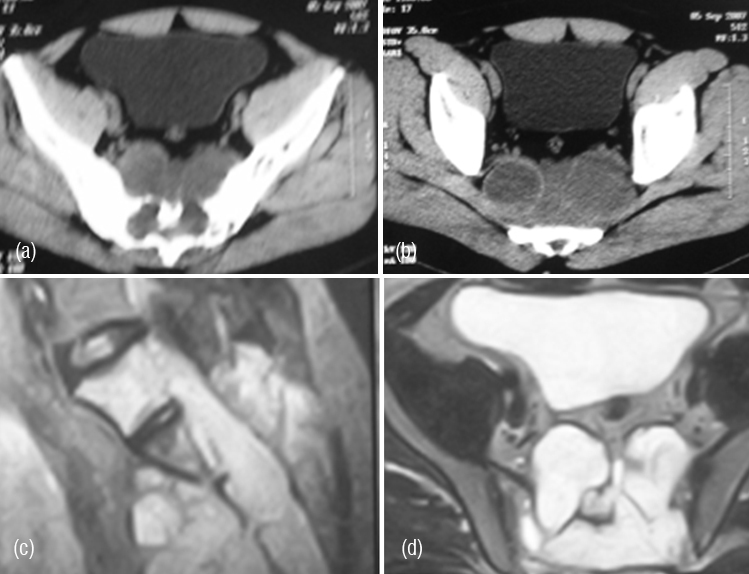 Figure 17: (a,b) CT – Myxopapillary ependymoma of sacrum. Lytic and sclerotic changes with cyst like soft tissue masses. (c,d) MRI – Myxopapillary ependymoma of sacrum. Cyst like soft tissue masses in a lytic sacrum.