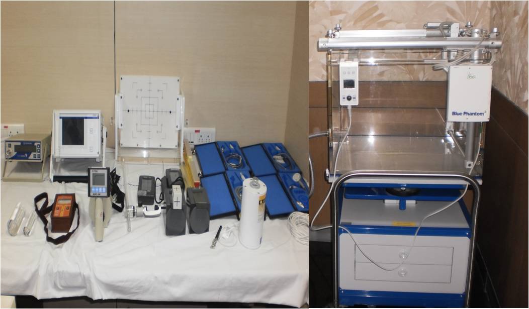 A) Machine specific QA with 3D-RFA and Ionisation chambers: The daily, weekly, monthly, quarterly, half yearly and annual QA of the machines is carried out using the 3 dimensional Radiation Field Analyser(RFA) and various types of Ionisation chambers as per the protocols of the Institute, which are formed on the basis of the national and international protocols. The equipment used for these QA tests are shown in figure 1.