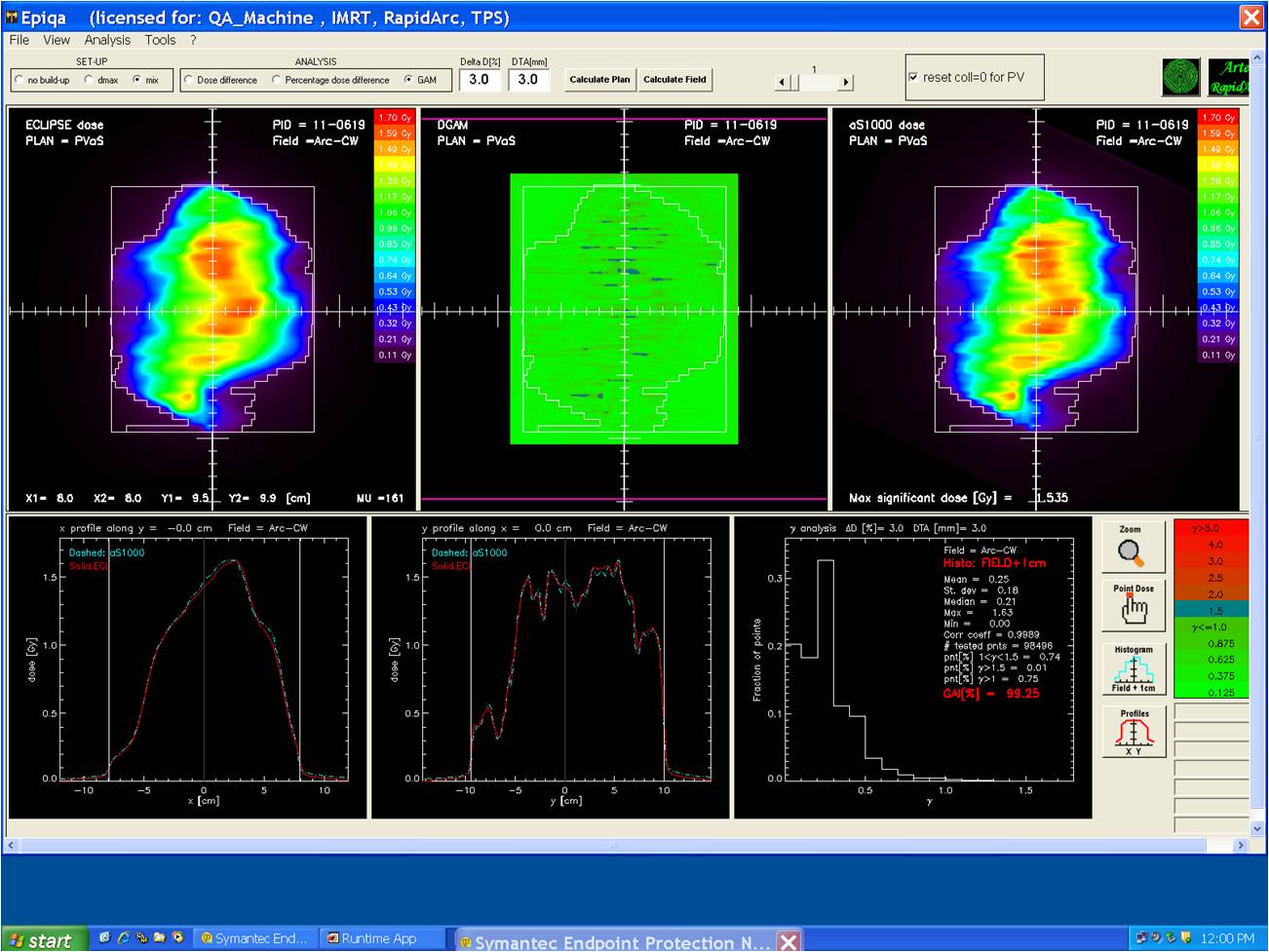 The calculated and measured planar relative dose distributions and absolute central axis (CAX) point doses are compared with profiles/isodose matching methods using their respective software’s. The 3mm DTA and 3% dose difference for the global Gamma Index (γ≤1) and 97 % data pass criteria is used for the analysis and the results obtained were presented. The planar dose evaluation of a typical RapidArc plan done with portal dose prediction and Epiqa software is shown in figure 5. The evaluation of planar dose matrix of another typical RapidArc plan done with Imatrixx-2D array phantom and Omnipro Imrt software is shown in figure 6.