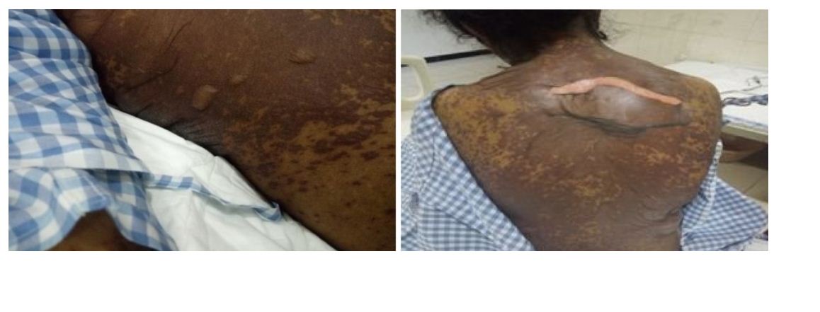There was no history of any drug intake in the last 4 months. There was photosensitivity and increased severity of joint pains. No history suggestive of Raynauds. On there is evidence of eyelid edema with erythema and crusting [1], vesiculobullous rash over trunk, extremities, orogenital regions, rash over face on clinical examination (Figure 2). Tachycardia and tachypnea and high blood pressure, were recorded.