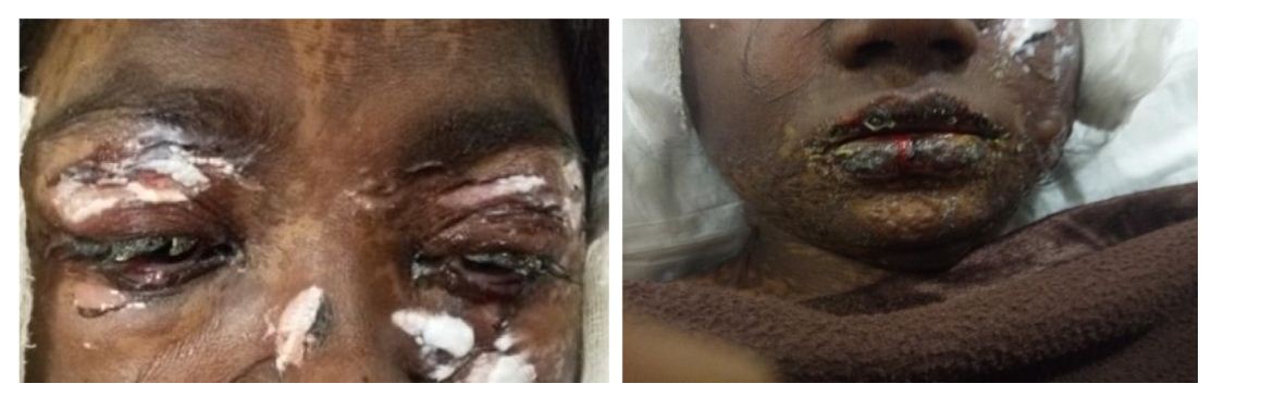 A 19-year-old girl presented with joint pains and constitutional symptoms for 5 months. Elsewhere she was started on disease-modifying antirheumatic drugs (DMARDs) and defaulted after one month. Gradually in the next five months she had worsening of constitutional symptoms. She presented to the emergency department with sudden onset of pain with redness of eyes and vesiculobullous rash involving mucosal sites, face, trunk and extremities (Figure 1).