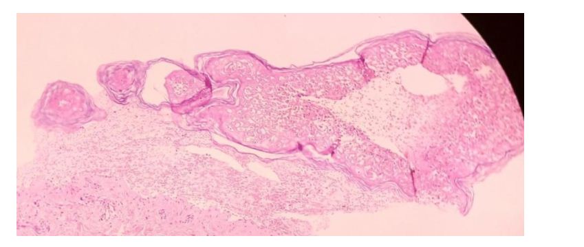Her serology revealed 3+, homogenous ANA and positive anti ds DNA and low complements. There was evidence of renal involvement in the form of new onset hypertension, subnephrotic range of proteinuria, elevated blood urea and serum creatinine. Her 2D Echo showed global hypokinesia with dilated left atrium (LA), severe left ventricle (LV) dysfunction, dilated, plethoric IVC. She also had serositis (pleural and pericardial). Her skin biopsy showed orthokeratosis of epidermis and transepidermal coagulative necrosis with exocytosis composed of lymphocytes, eosinophils and nuclear debris (Figure 3). Complete detachment of epidermis was seen. Dermis showed thin walled vessels with perivascular lymphoid infiltrate. Skin biopsy features were consistent with TEN.