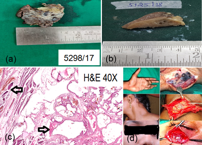 Figure 3a-d: Venous malformation- Large malformed, irregular venous channels with muscular walls with internal organizing thrombi.
