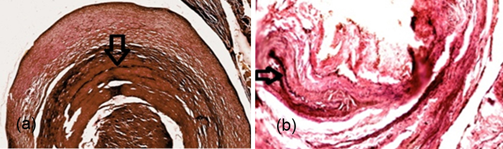 Figure 6a,b: AVM- Elastic stain highlights the disruption of elastic lamina characteristic of arteries (Verhoeff- van Gieson stain).