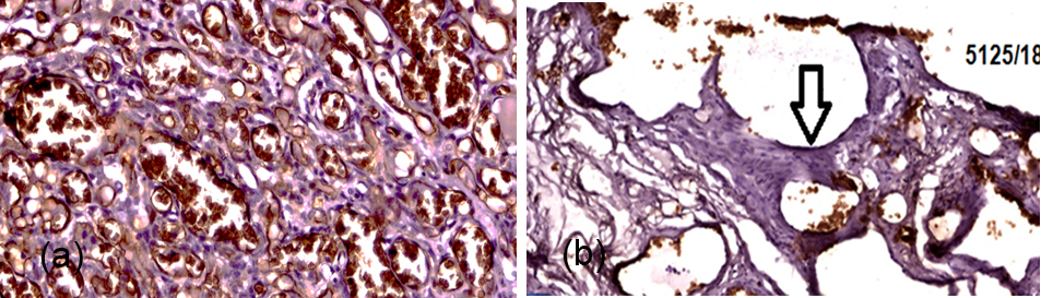 Out of 22 vascular tumors, infantile hemangiomas were 06 (Figure 2), spindle cell hemangiomas were 7 and pyogenic granulomas were 9. Of 25 vascular malformations, 15 cases were venous malformations (Figure 3), 09 cases were Lymphatic malformations (Figure 4), and 1 case of Arteriovenous malformation (Figure 5). Further, all the samples were studied with elastic tissue stain for the confirmation of AVM’s (Figure 6). IHC with GLUT-1 marker was performed on all the 6 infantile hemangiomas and remaining other cases of VTs and VMs which confirmed the positivity in all cases of infantile hemangiomas (6 cases) (Figure 7a) and the result was negative (Figure 7b) in the remaining group of vascular tumors and malformations. Figure 1 illustrates the overall results of the present study.