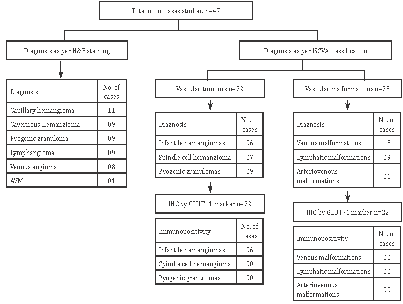 Results: Of 47 patients, the male to female ratio was found to be 1.06:1 and 46.80% of cases were vascular tumors, whereas 53.19% cases were vascular malformations in this study. Of 22 cases histologically diagnosed as vascular tumors, 06 cases were infantile hemangiomas and showed immunopositivity with GLUT-1 marker and the rest of vacular tumors and malformations were immuno negative for GLUT-1.