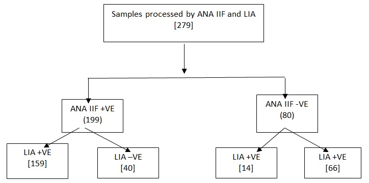 Among the 279 ANA samples processed, 199(71.3%) samples were ANA IIF positive in 1:100 serum dilutions. Of these positive ANA IIF, 159(79.9%) were LIA positive (Figure 1).