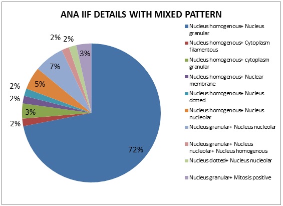 Mixed pattern is the most common ANA pattern, seen in 57(29%) of the positive 199 ANA IIF samples. In comparison with LIA, the same mixed patterns of autoantigens were observed in 25 (44%), single autoantigens in 24(42%) and 8 samples (14%) were negative. The various autoantigens observed mixed pattern by IIF method are shown in Figure 3. The most common mixed pattern observed was Nucleus homogenous and Nucleus granular seen in 41(72%) samples.