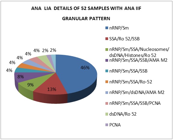 Nucleus granular pattern showed a close association with nRNP/Sm, SSA, SSB and Ro52 in 88.4% of the cases with varying combinations with other patterns showing the predictability of these autoantibodies in samples with granular pattern.