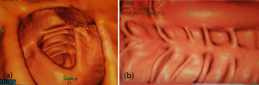 Figure 1: (a) Axial view of CT colonoscopy shows normal haustral folds and mucosal surface; (b) Longitudinal palette view of CT colonoscopy demonstrates spread out lumen.