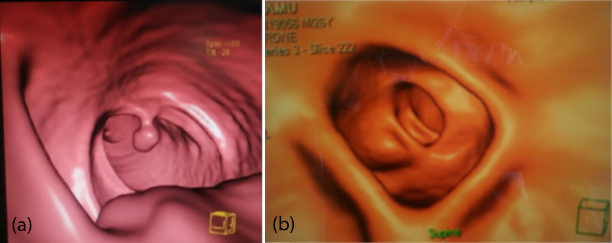 Figure 2: (a) Axial view of virtual colonoscopy reveals a pedunculated polyp; (b) CT colonoscopy in axial view shows a sessile polyp at 7o position.